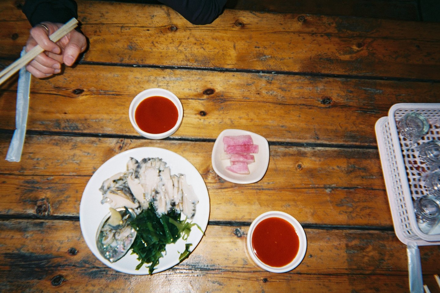 We asked about the workload, and they said they were around 6-8 hours in the water, one week on and one week on land to de-climateize. They told us that it was warmer in the water during winter, as in the spring, the snow is melting and the ocean gets colder. I feel this deep respect for these women, knowing they have provided for their families, raised their kids, holding deep knowledge about the ocean and nature and endured in a profession for decades. Without any oxygen tanks or fancy equipment, they dive down with incredible skills, up to 10 meters to collect seafood. They hold space for shamanism and ceremonies to pray for the ocean and stay together in communities.