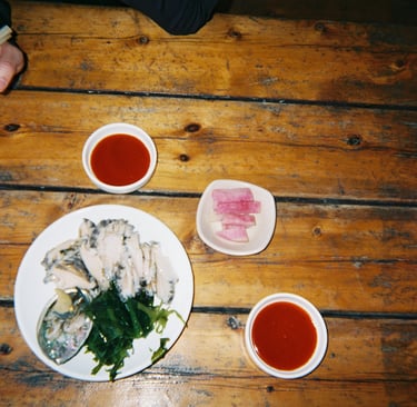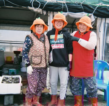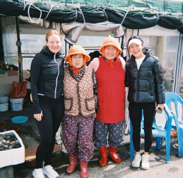 Back in March, when I was visiting Jeju for the third time, I was exploring the island's southwest coast, and as I was going for a coastal walk, I spotted the women diving. A few days later, I headed back with my Korean-Australian friend, and we got the pleasure of talking with three of the ladies. We spotted them tending their restaurant, which is a container tent built on the shore where bypassers can enjoy fresh raw abalone, sea conge and other delicacies caught fresh that day. All three of them, giddy, smiling, happy to chat. The youngest was in her 30s and the oldest had dived for 40 years already.